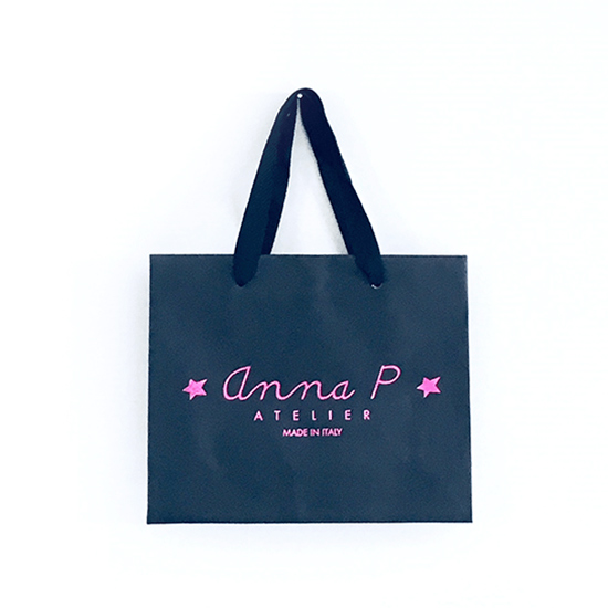 Buste eleganti con maniglia in fettuccia di cotone e stampa a caldo su fronte e retro.